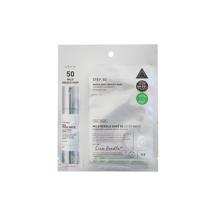 Jeg er VT Cosmetics Mild Reedle Shot 50 2-step Mask. Jeg består av 50.1g Mild Reedle Shot 50 i tillegg til en Reedle Shot Comfort Mask 50. Jeg er et to stegs sett som skånsomt hydrerer sensitiv hud samtidig som jeg sørger for å øke hudens opptak av aktive hudpleieingredienser. Jeg virker beroligende og vil bidra til å roe ned irritert hud, samt styrke en svekket hudbarriere.